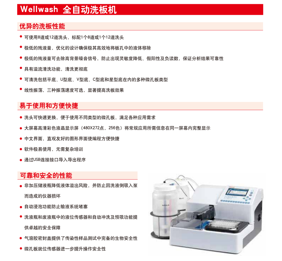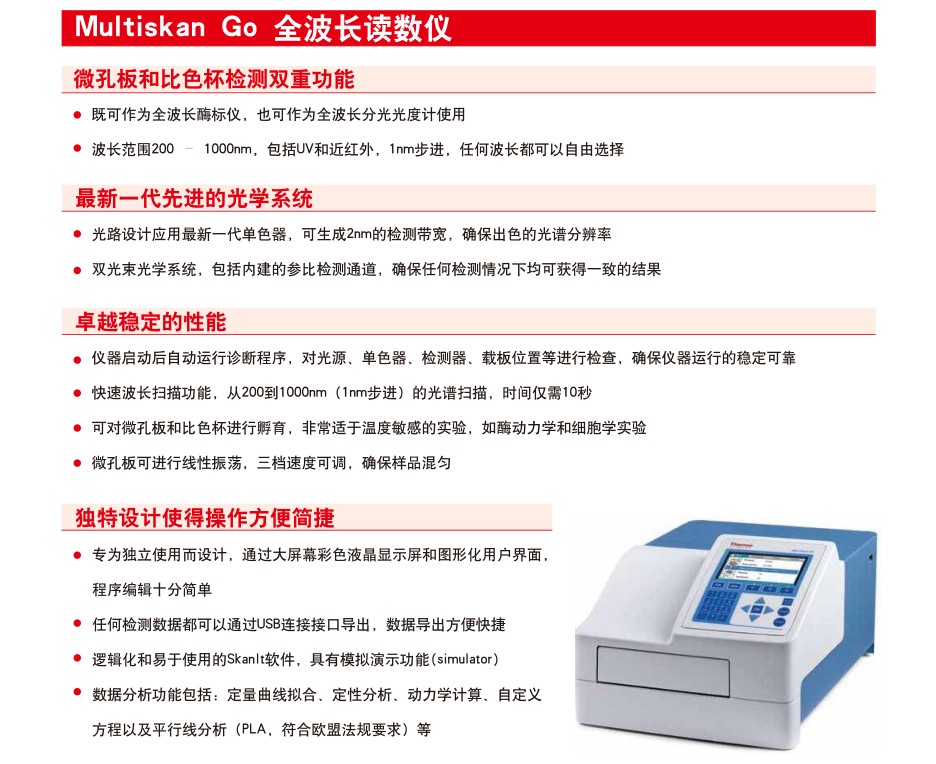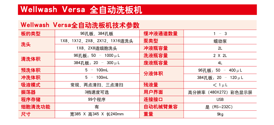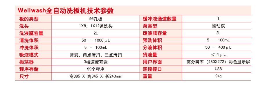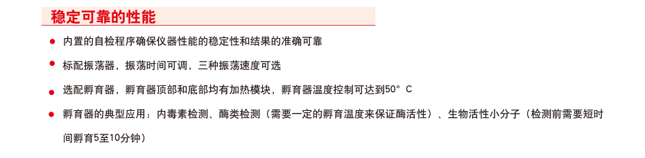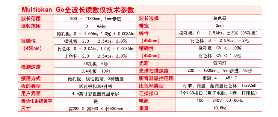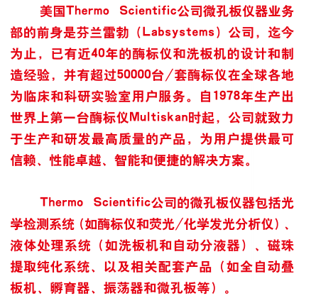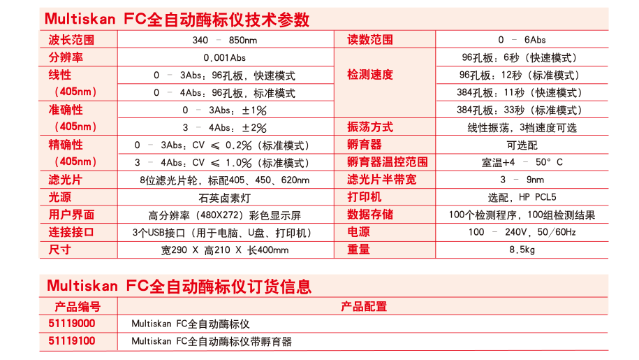 FC(不带孵育器)技术参数 1、光源:石英卤素灯 2、*检测通路:单光路检测,两个参比通道(空白参比通道、背景参比通道) 3、*波长范围:340-850nm 4、滤光片:8位滤光片轮,标配三块滤光片:405、450、620nm. 5、*读数范围:0-6 Abs 6、准确性(405nm):±1% (0-3Abs),±2%(3-4Abs) 7、精确性(405nm):CV ≤ 0.2% (0 - 3 Abs), CV ≤ 1.0% (3 - 4 Abs),标准测量模式 8、分辨率:0.001Abs 9、线性范围:0-3Abs,96孔板,快速测量模式;0-4Abs,96孔板,标准测量模式 10、测量速度:6 s,96 孔板,快速测量模式;12 s,96 孔板,标准测量模式 11、适用板型:96孔板 12、振荡器:线性振荡,三档速度可选 13、*按键显示:高分辨彩色液晶显示,图形化界面,支持中文在内的多国语言 14、*数据存储:仪器内可存储100个测量程序和100组测量结果,数据可通过USB接口导出,具有3个USB接口分别连接电脑、U盘、打印机 15、软件:包括SkanIt软件,无须密码狗,不限安装 16、*进口品牌,国内组装 |
